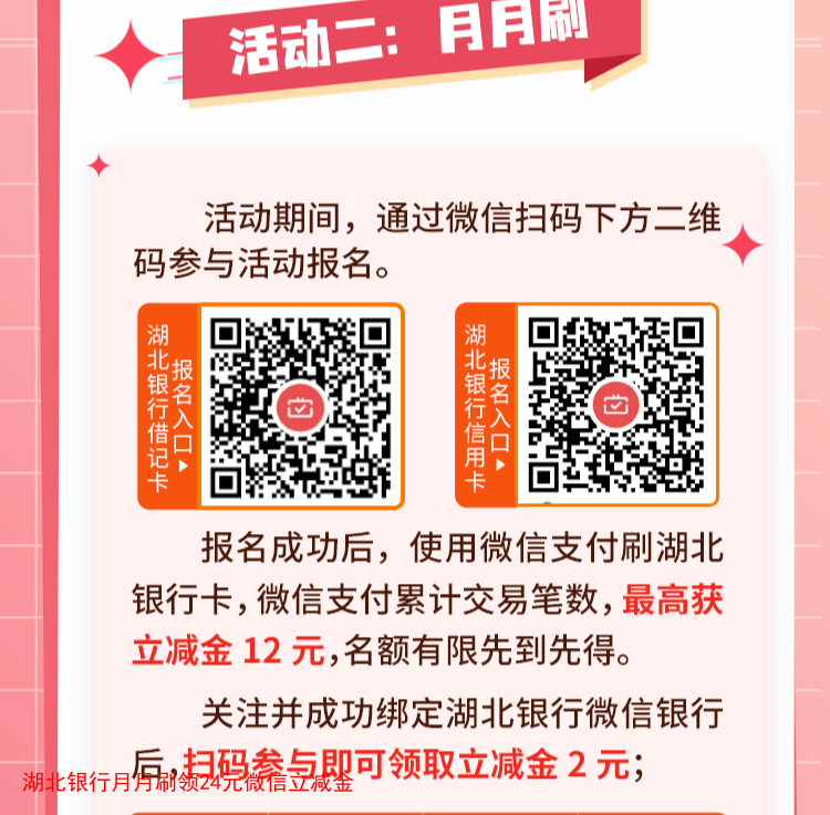 活动时间3月1日至3月31日,湖北银行借记卡/信用卡持卡人,扫码月月刷活动二维码参与活动,即可领取最高24元微信立减金奖励。借记卡和信用卡可分别参与,报名参与成功立即获得2元微信立减金奖励,30天内使用湖北银行借记卡或信用卡完成6次累计5元以上的消费可分别再领取10元微信立减金。