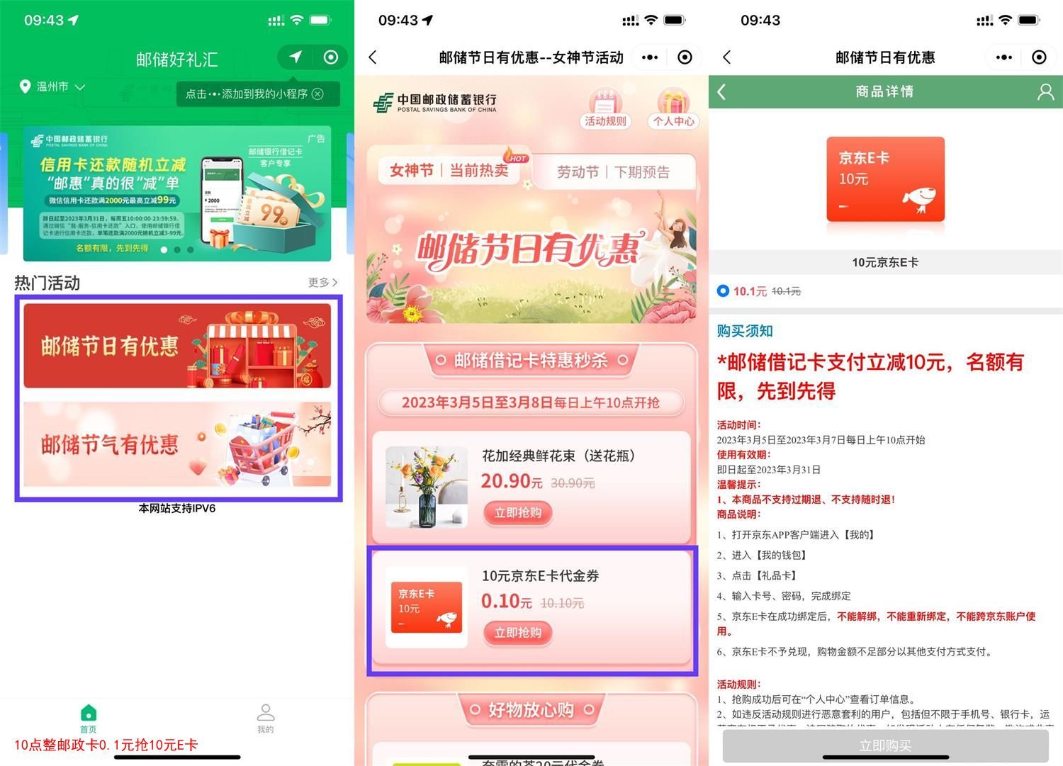 微信进入小程序“邮储好礼汇”->点击横幅进入->10点整使用邮储卡支付0.1元抢10元京东E卡