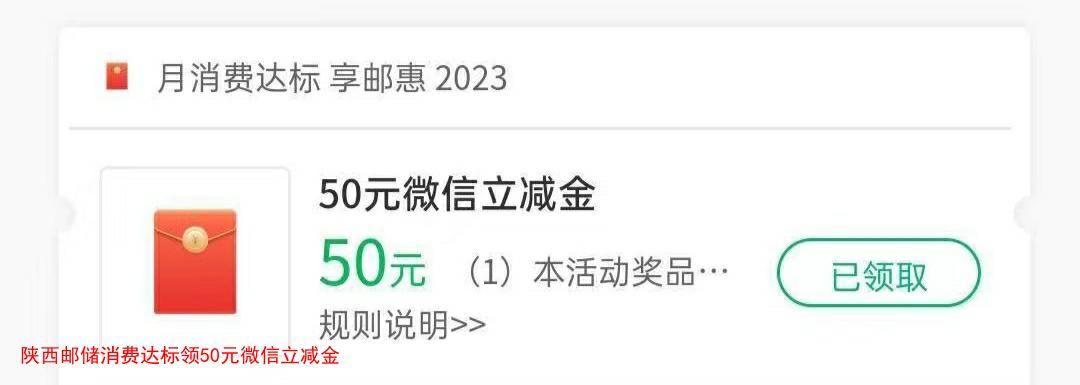 陕西邮储消费达标领50元微信立减金