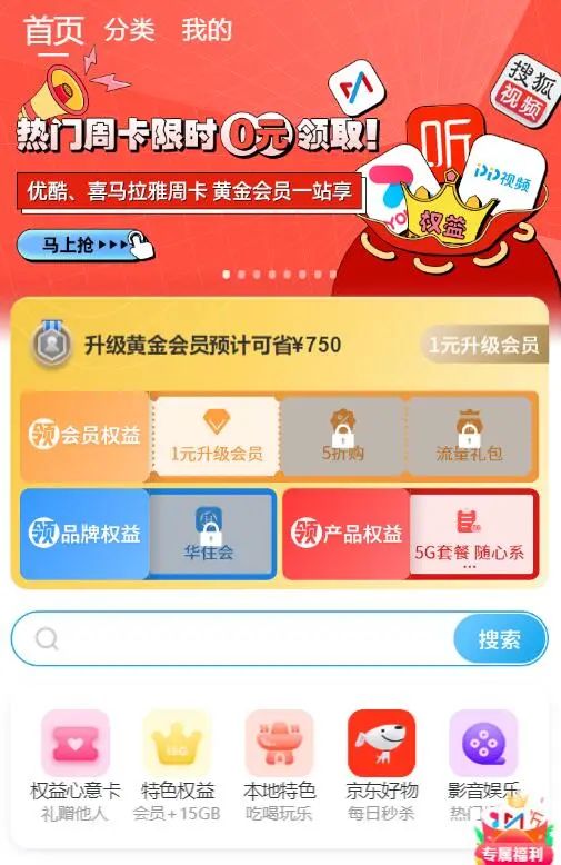 移动黄金会员每月领取优酷、搜狐等VIP周卡0元,打开活动顶部滚动图片【热门周卡限时限0元】参与,右键【50折】,还可以半价购买会员等,有需要的可以去领子