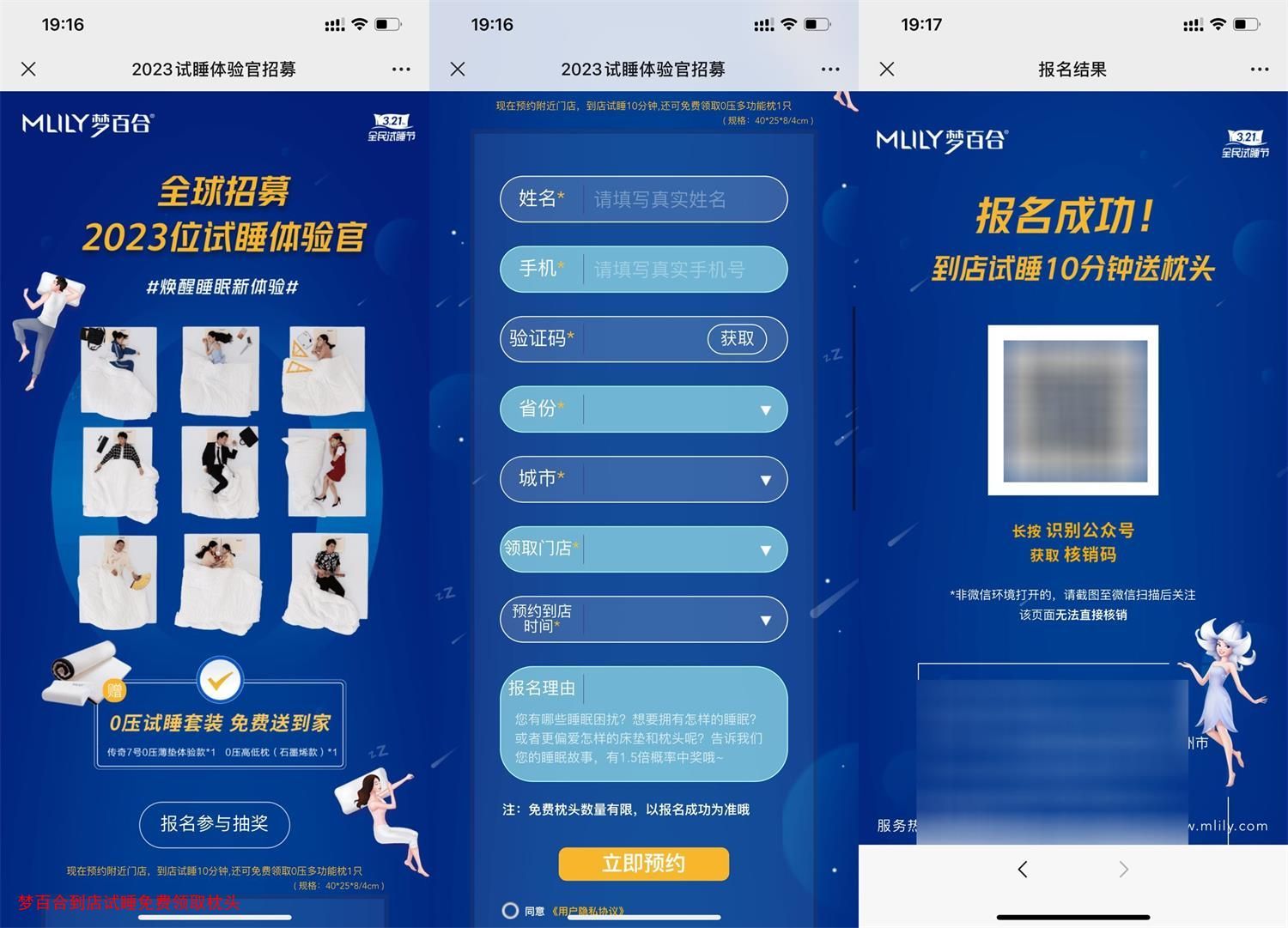打开地址填写预约->预约时间到店试睡10分钟领梦百合定制枕头,全国门店均可参与!