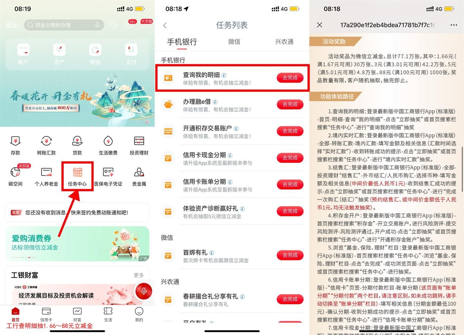 工行查明细抽1.66~88元立减金