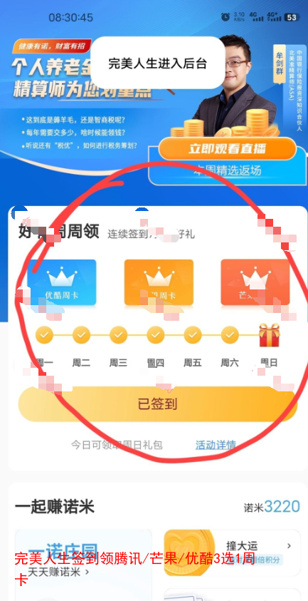完美人生APP签到7天领周卡直充登录手机号