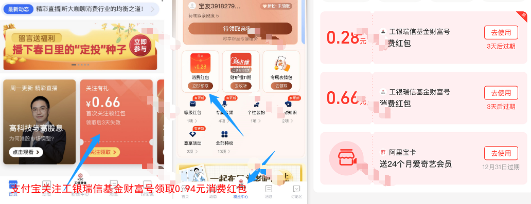 支付宝关注工银瑞信基金财富号领取0.94元消费红包
