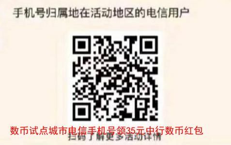活动期间,符合资格的电信手机号用户通过扫码进入活动领取1张满30减15元和2张10元无门槛数字人民币红包,领取后开通中国银行数字人民币四类钱包即可到账。红包可在“翼支付”App——数字人民币商城充电信手机号话费使用。数量有限先到先得。