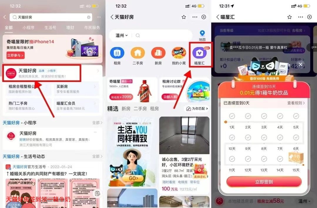 支付宝搜索“天猫好房”->喵屋汇->连续签到15天0.01元领一箱牛奶包邮!