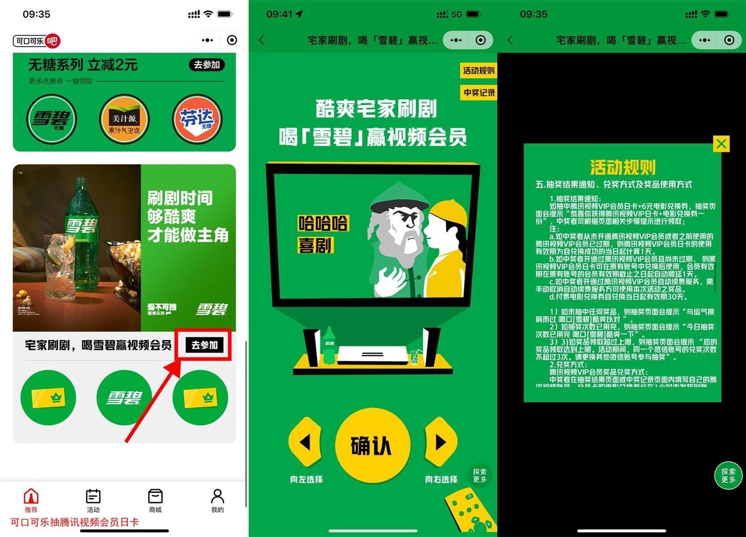 微信进入小程序“可口可乐吧”->下拉页面“宅家刷剧”进入->每天2次机会抽腾讯视频会员日卡