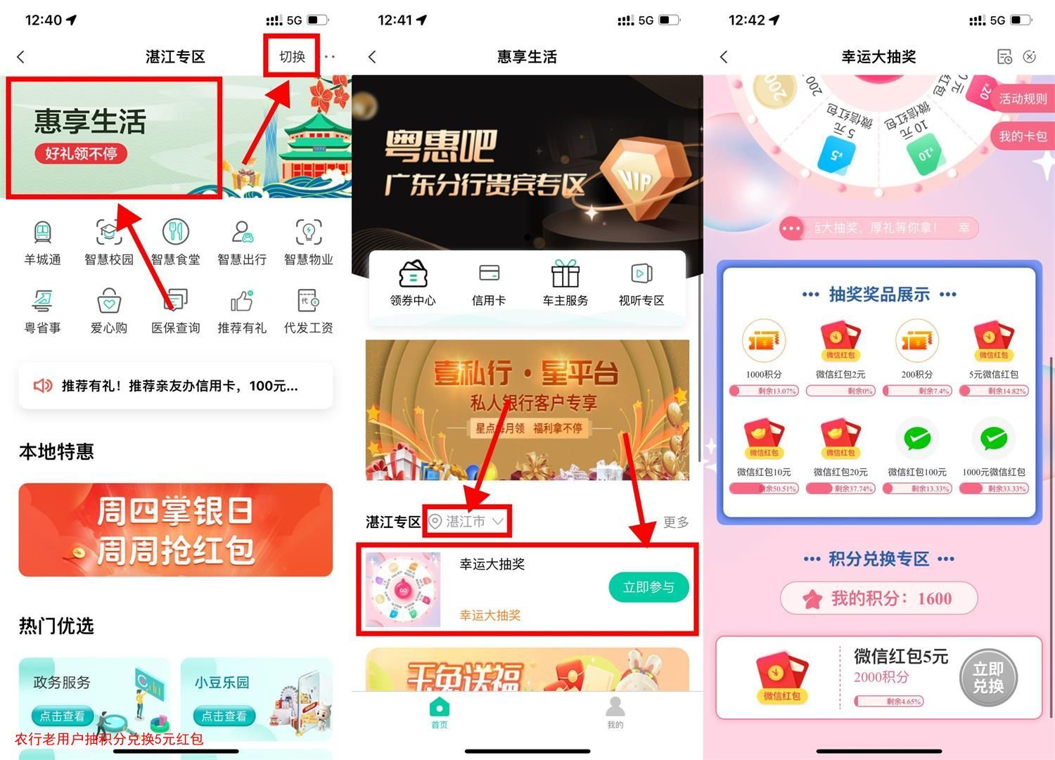 1、农行APP搜索“城市专区”->右上角选择“湛江”->惠享生活->再次选择“湛江”->幸运大抽奖