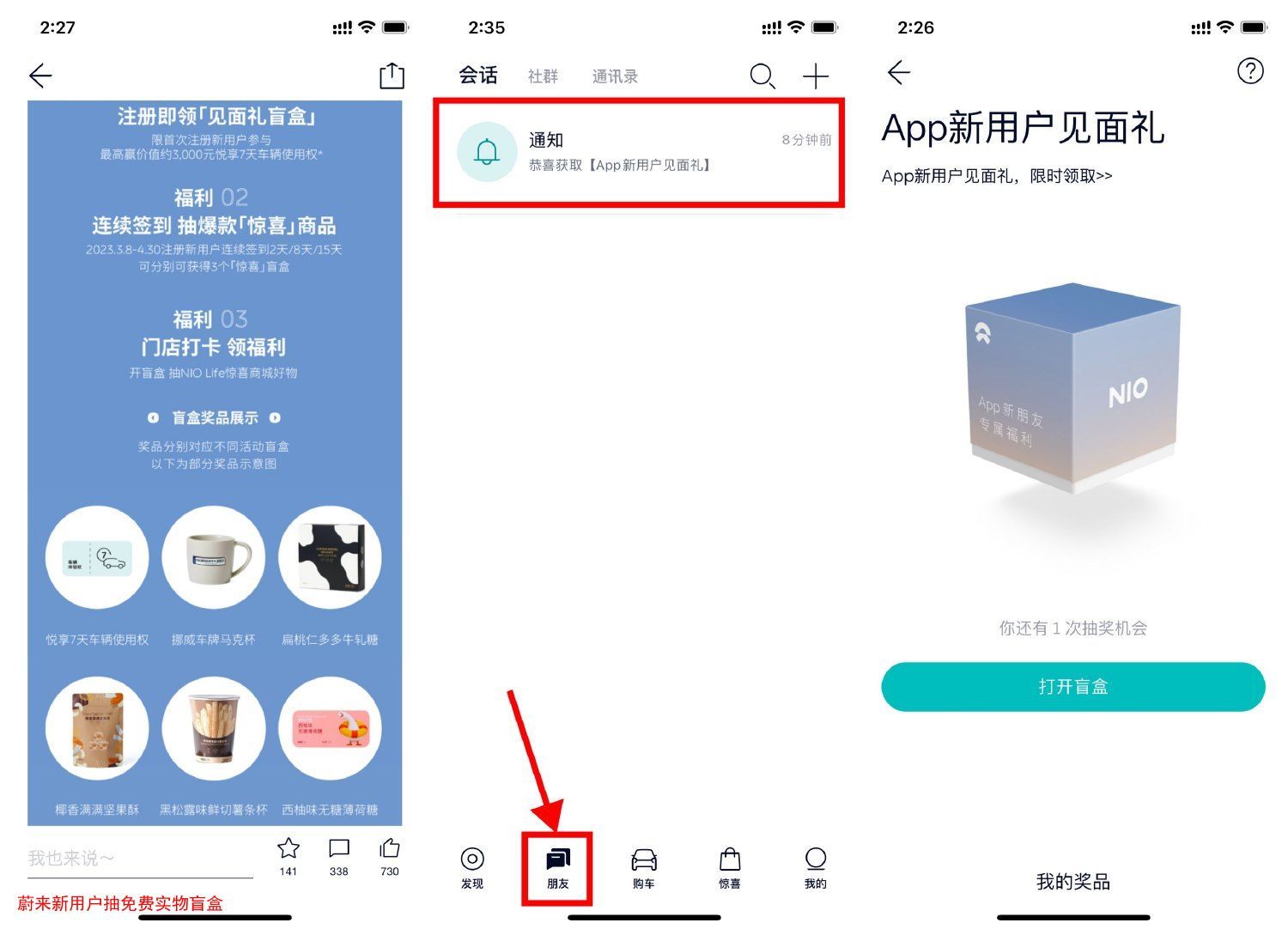 蔚来APP底部“朋友”进入“通知”抽免费实物包邮(抽中商城券没用),连续签到2/8/15天分别得一个盲盒再抽实物