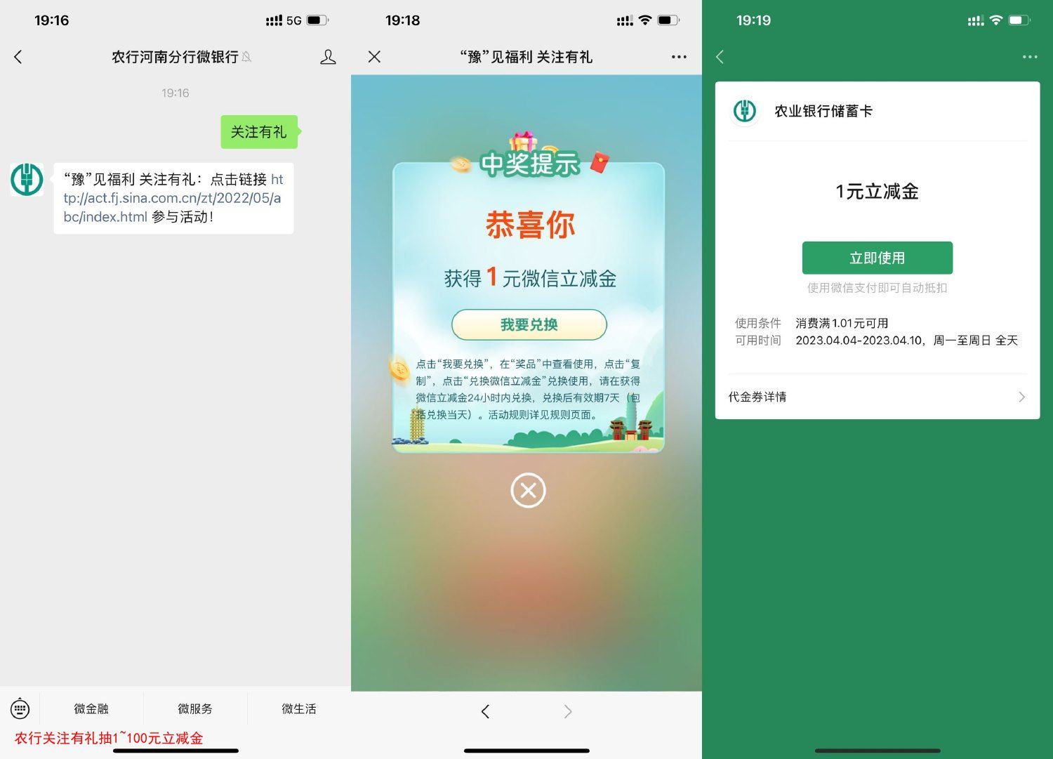 微信关注公众号“农行河南分行微银行”->发送“关注有礼”点击推文进入->直接抽微信立减金,抽中复制直接兑换秒到