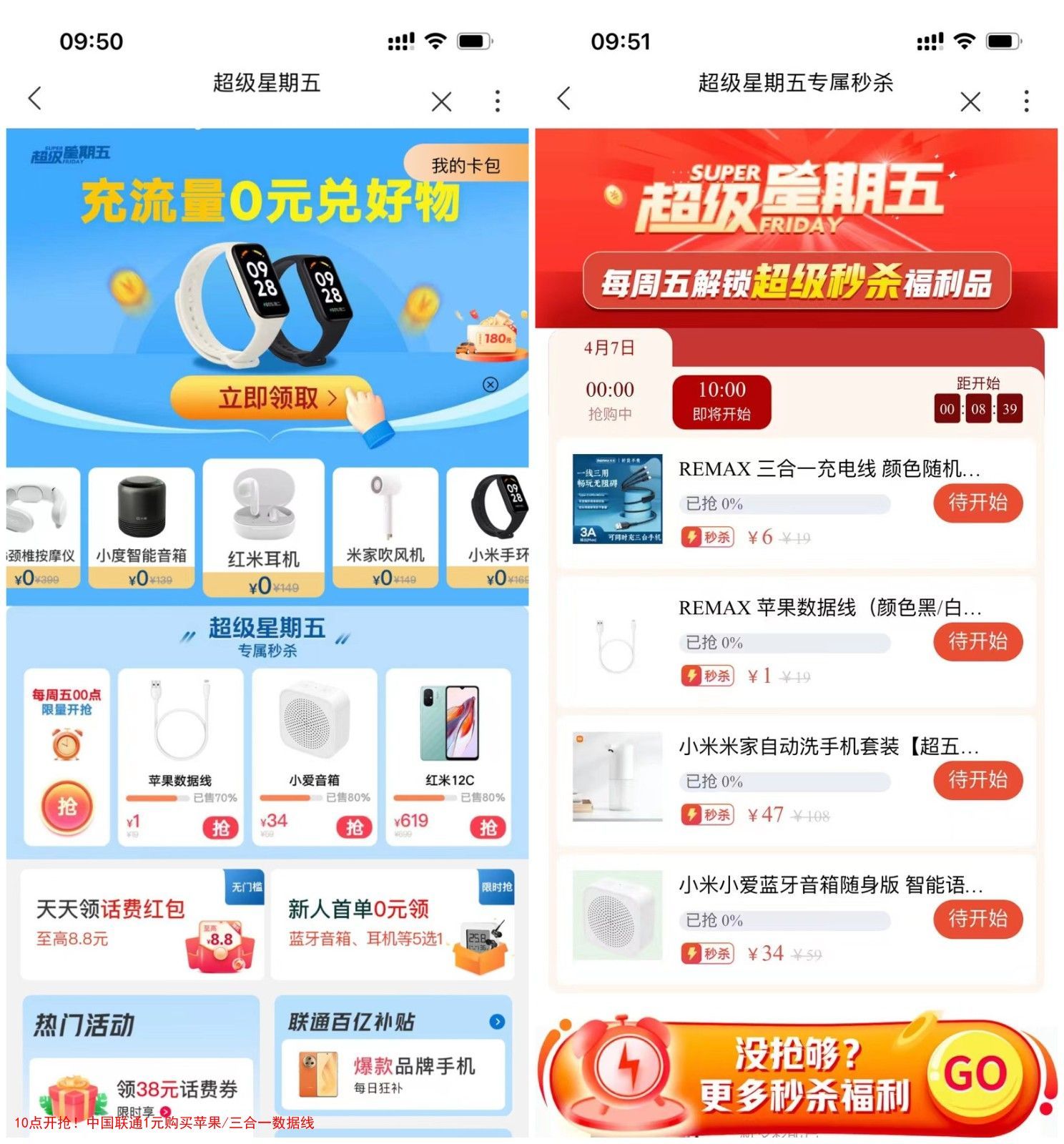 打开中国联通APP首页顶部搜索【超级星期五】进入,专属秒杀1元购买数据线