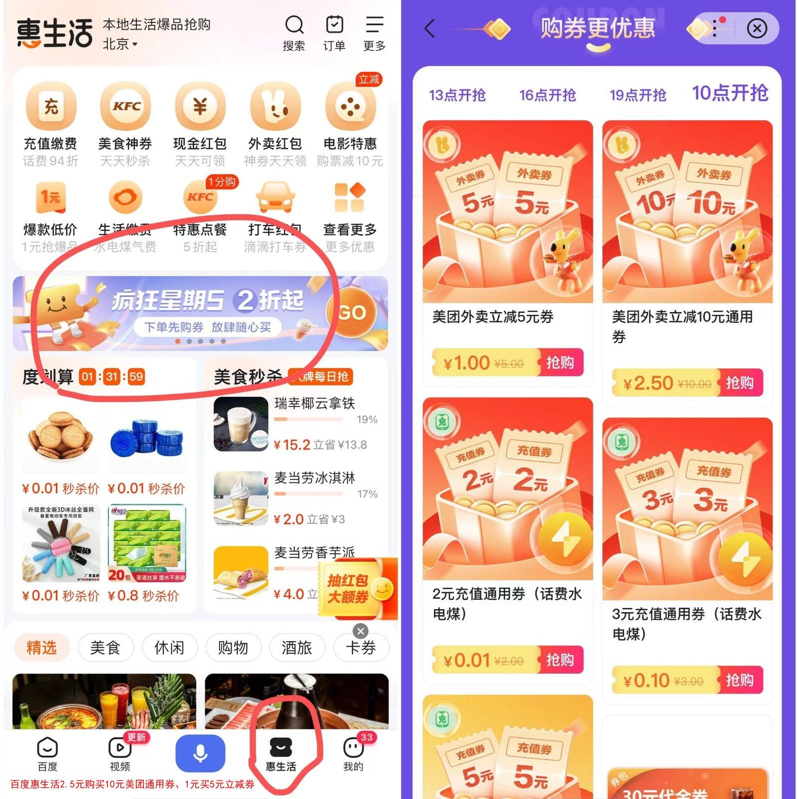 百度惠生活2.5元购买10元美团通用券、1元买5元立减券