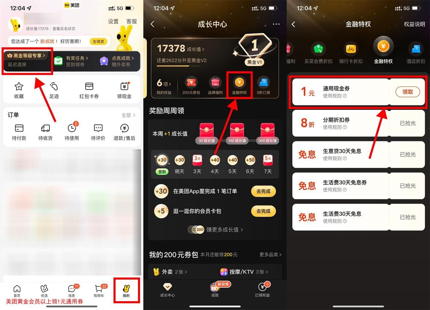 美团APP->我的->会员等级进入->金融特权->领取1元通用现金券