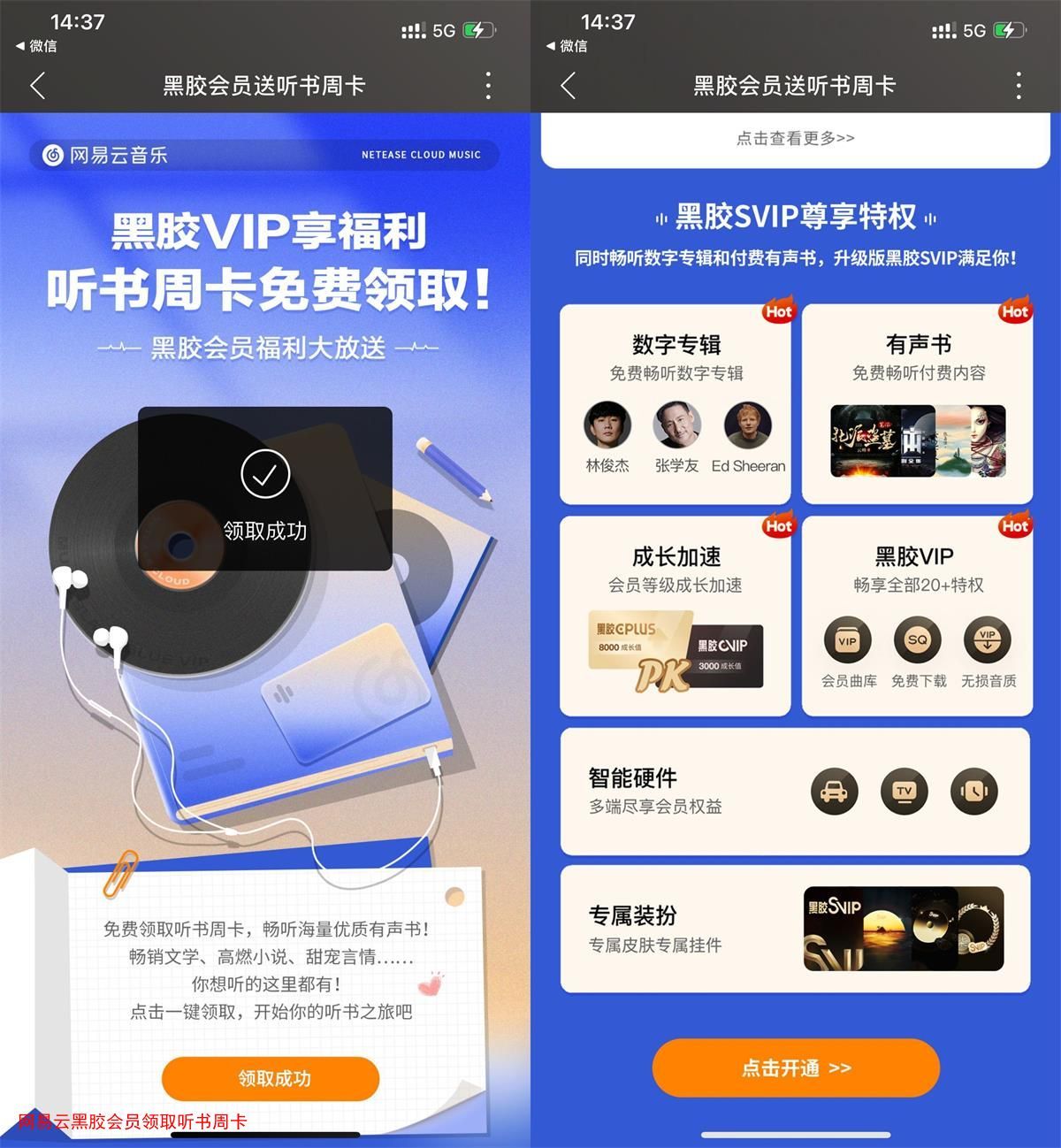 打开地址->跳转到网易云音乐APP->直接领取周卡,喜欢听有声书的上!
