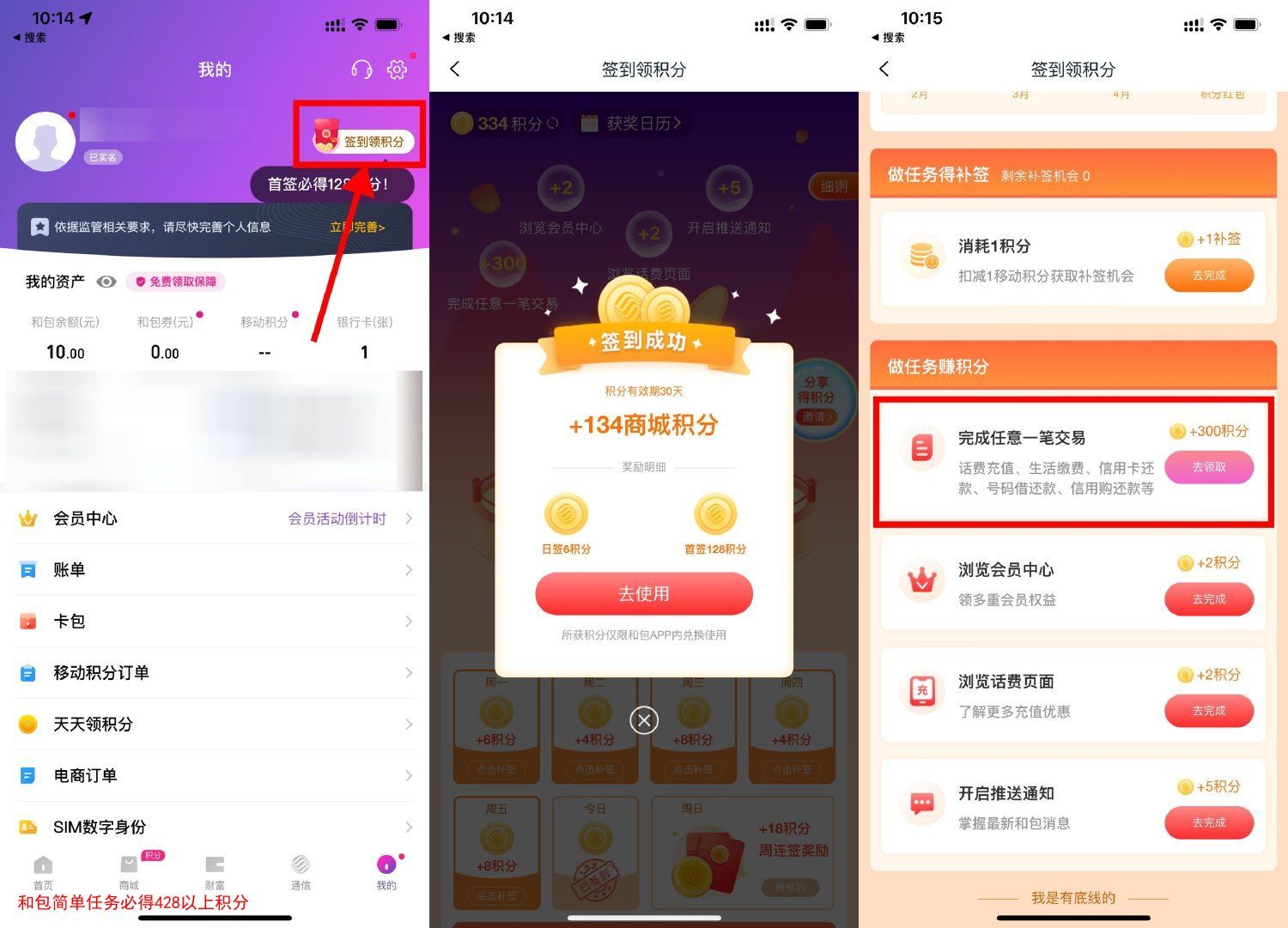 我的->右上角签到->进入必得128以上积分->然后返回首页右滑找到“转賬”,随便给自己小号转0.01元->重新进入签到页面下拉领300积分