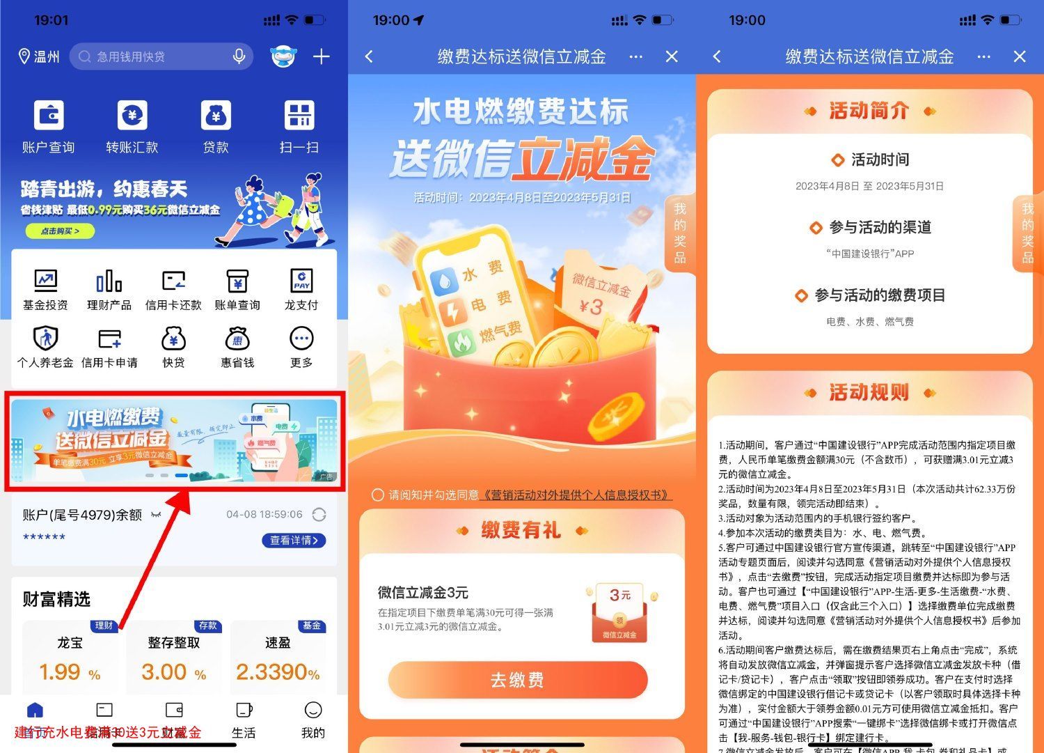 1、建行APP首页横幅进入->充水、电、燃气费满30元送3元微信立减金