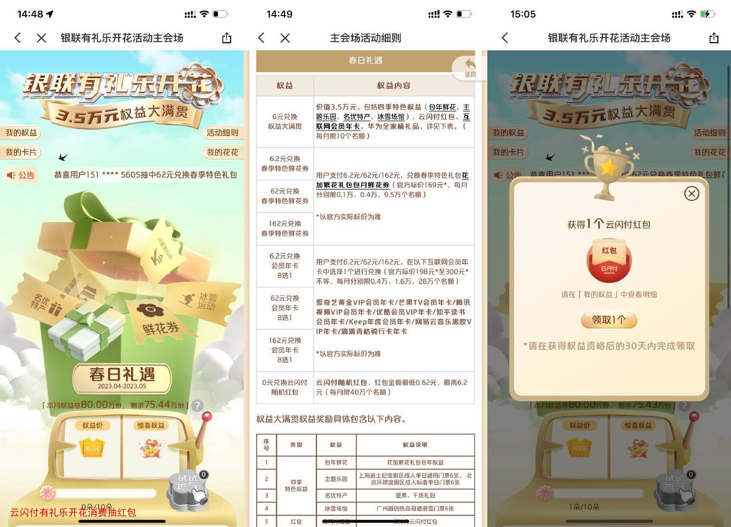 2、累计10朵花花抽云闪付红包、视频会员年卡、鲜花实物、6张迪士尼门票等