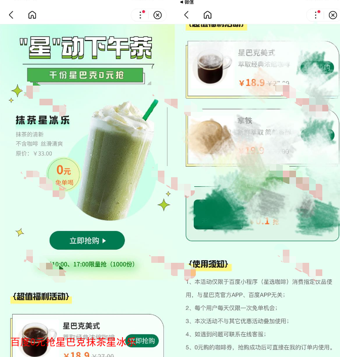 百度APP扫码->准点抢星巴克抹茶星冰乐免单券,每个时段限量1000份